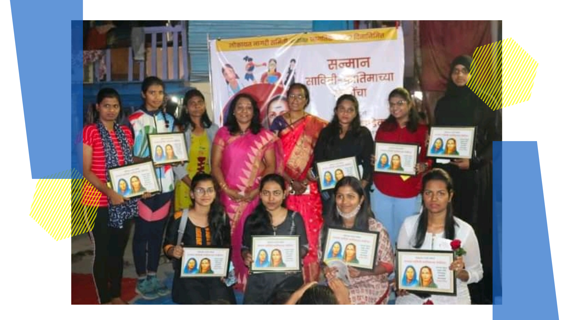 | Millions of ordinary women from the margins of society, strive daily to achieve a good life for themselves and their families. They wage a daily struggle against patriarchy, casteism and poverty. In order to appreciate their struggle and inspire other girls, we felicitated 18 girls from Ganj Peth & Lohiya Nagar slums in Pune.